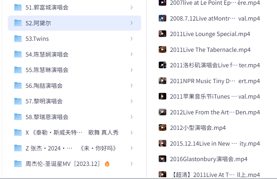 全球·明星演唱会·合集【珍藏版】 资源分享 栏目:音乐资源 作者:admin888 时间:2025-06-10 11:01:51 合集中包含大约60位明星的演唱会,都是知名度很高的我们喜欢的歌手,图片中的只是一小部分,有兴趣的可以详细看看。链接:https://pan.quark.cn/s/7eec63d404b6